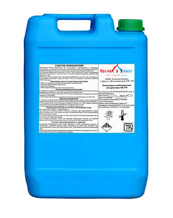 Композиция ОК-ГФ — применяется как огнебиозащитное средство для обработки деревянных конструкций. Предназначена для внутренних (наружных - при дополнительной защите обработанных поверхностей лаком ХВ-784) работ при защите деревянных конструкций жилых, общественных и производственных зданий от возгорания.
