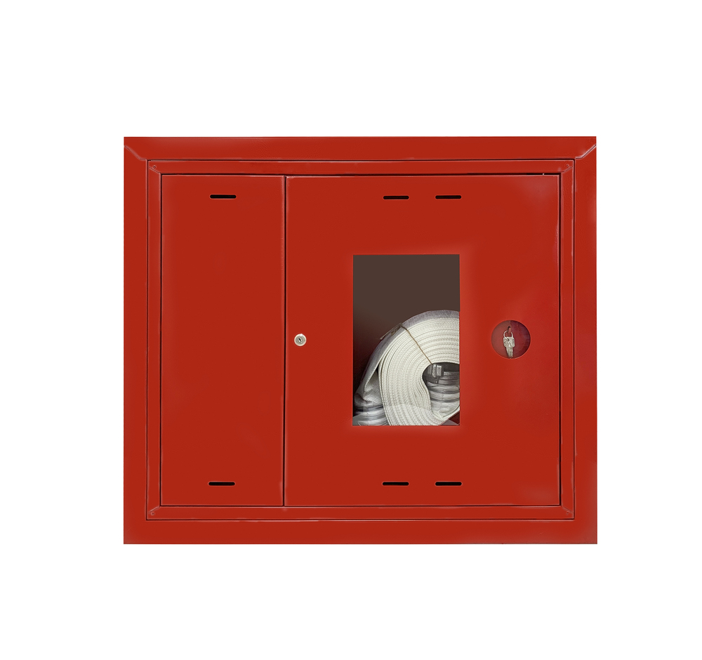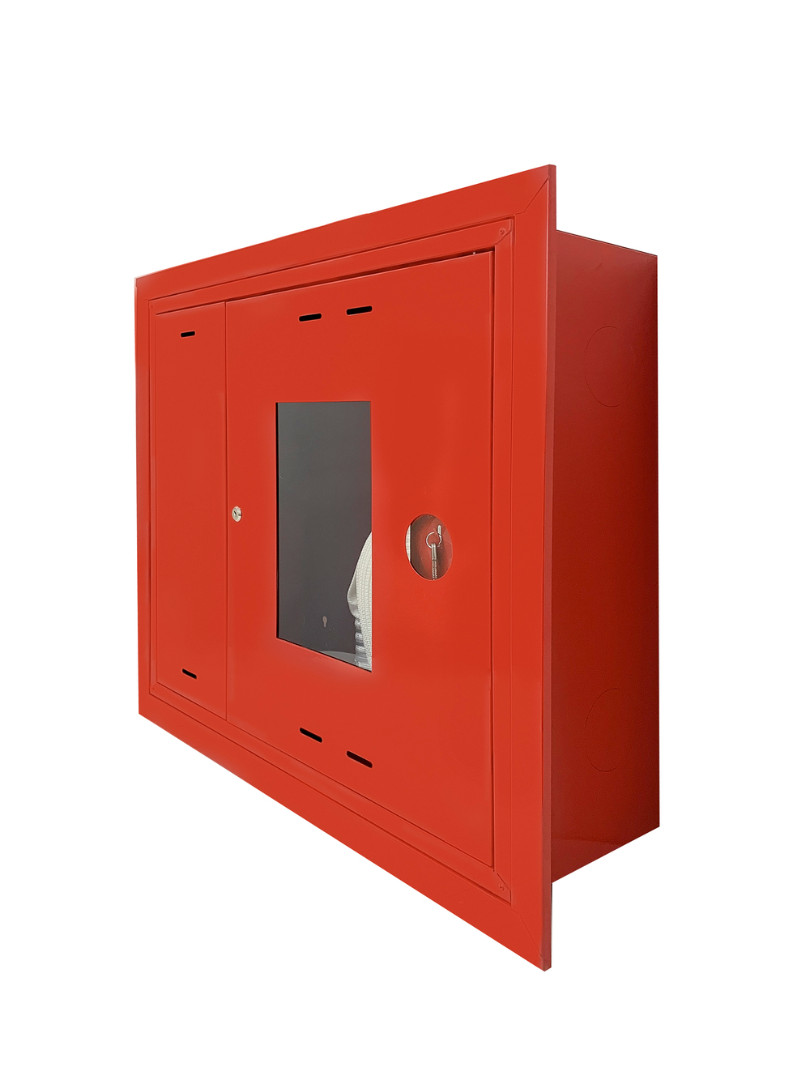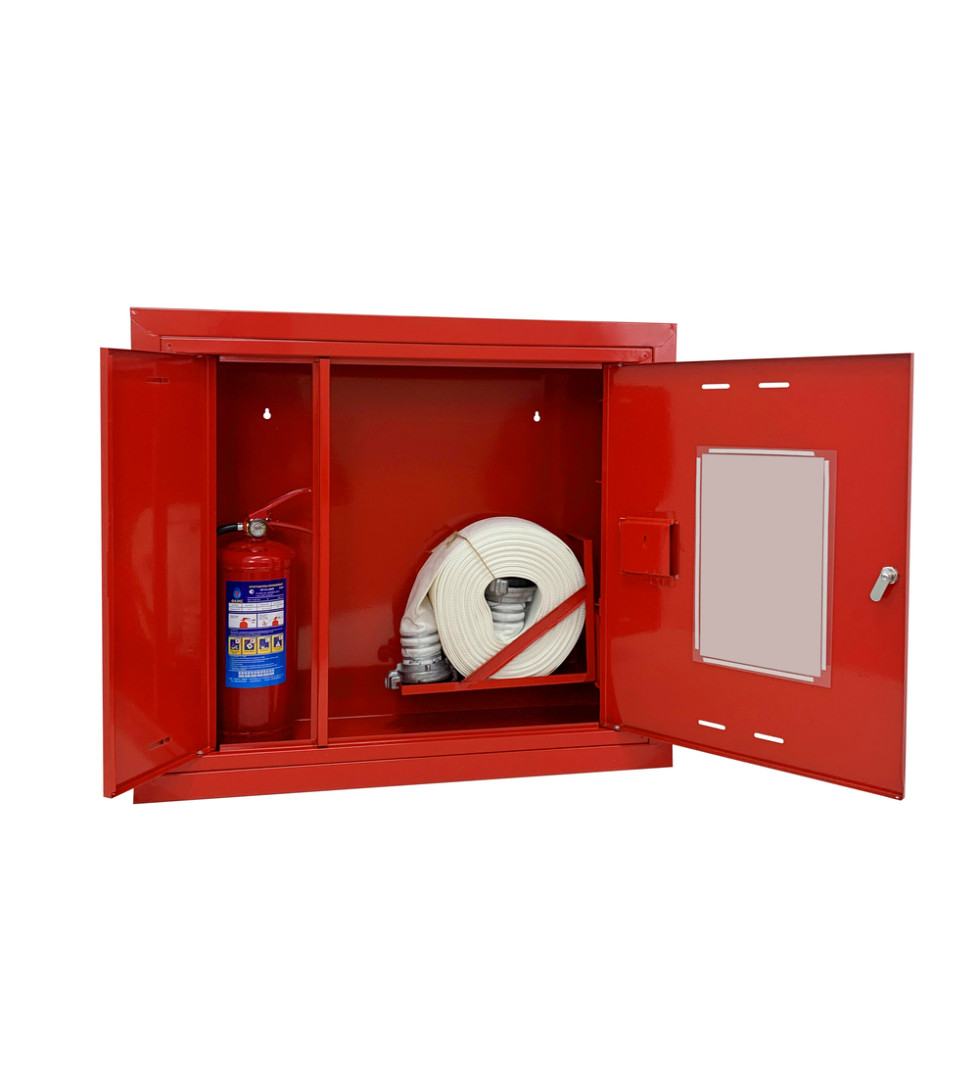 - Предназначен для размещения комплекта пожарного крана Dy50 или Dy65 (с угловым клапаном) и одного огнетушителя.